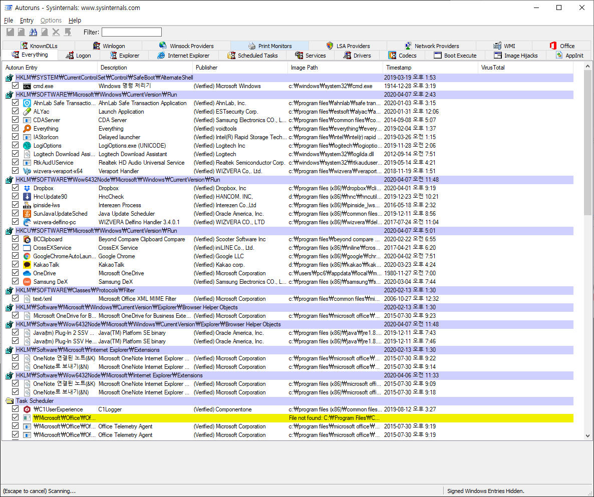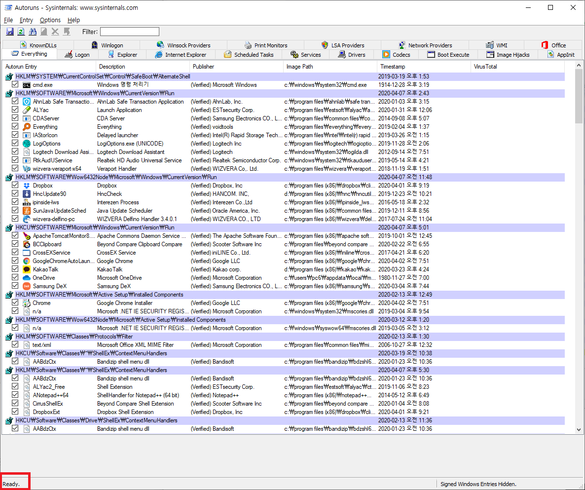 다운로드한 autoruns.exe 를 실행 후